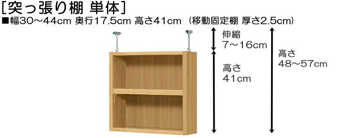 スペースにピッタリサイズでオーダー可能 オーダ突っ張り棚 厚棚板(厚さ2.5cm) 奥行17.5cm×高さ48〜57cm×幅30〜44cm 幅は1cm単位で指定 厚棚板(厚さ2.5cm) 棚板耐荷重:30kg 奥行17.5cm 高さ48〜57cm 幅30〜44cm お客様組立て 低ホルムアルデヒド