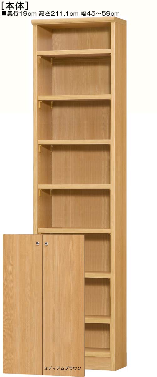 スペースにピッタリサイズでオーダー可能 扉付オーダー本棚 厚棚板(厚さ2.5cm) 奥行19cm×高さ211.1cm×幅45〜59cm 扉高80.8cm 幅1cm単位指定 扉付 棚板耐荷重:30kg 奥行19cm 高さ211.1cm 幅45〜59cm 扉高80.8cm お客様組立 低ホルムアルデヒド ご注意 オプション加工を選択されても価格が自動計算されません。