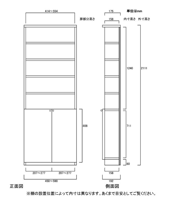 商品仕様 ■タイプ: 扉付 タフ棚板(棚板厚さ2.5cm)タイプ 両開き ■棚板耐荷重: 30kg ■外寸: 奥行19cm×高さ211.1cm×幅45〜59cm (幅は1cm単位でオーダーできます) ■外寸(幅): 45cm 46cm 47cm 48cm 49cm 50cm 51cm 52cm 53cm 54cm 55cm 56cm 57cm 58cm 59cm ■扉高(実寸): 80.8cm ■棚板枚数 移動固定棚板:7 共通仕様 ■材質: プリント化粧繊維板 ■塗装: ウレタン樹脂塗装 ■素材: ホルムアルデヒドの発生を最小限に抑えた基材・芯材・プリント紙・接着剤(F☆
