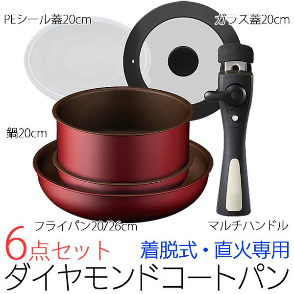 ●商品サイズ(約):幅29.0×奥行29.0×高さ16.3cm(パッケージサイズ)●材質 本体 内側:ダイヤモンドコーティング 外側:焼付塗装加工 PEシール蓋:ポリエチレン シリコン縁ガラス蓋:強化ガラス、シリコン樹脂●セット内容:フライパン20・フライパン26・なべ20・ガラスふた20・PEシールふた20・マルチハンドル