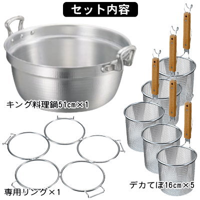 デカてぼ茹麺鍋セット 51-15cm用 デカてぼ茹麺鍋セット 51-16cm用 【商品仕様】 ●サイズ/デカてぼ:外径φ160×深さ150×柄長さ210mm(適正麺量400g)、 鍋:内径510×深さ230mm(板厚2.7mm・容量38L) ●材質/(デカてぼ)網:18-8ステンレス(6.5メッシュ)・柄:天然木、 (リング)18-8ステンレス、(料理鍋)アルミニウム ●セット内容/デカてぼ16cm×5、キング料理鍋51cm×1、デカてぼ 専用リング51-16cm用×1 ●日本製 ※メーカーに在庫がある場合は2-4営業日以内に発送させて いただきますが、稀に在庫がない場合もございますので、 お急ぎの場合はお問い合わせください。